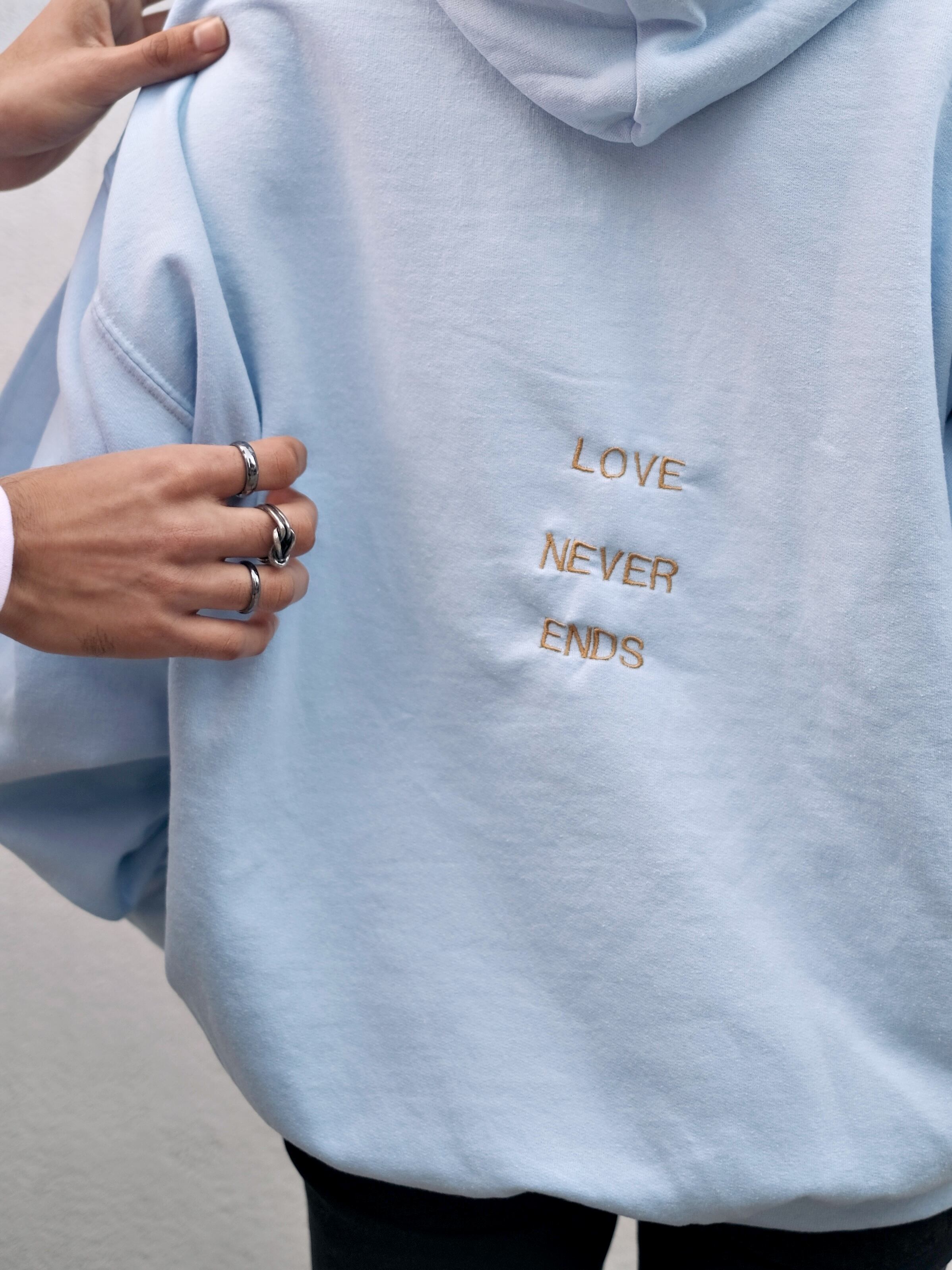 バックサイドにはLOVE NEVER ENDS の刺繍。